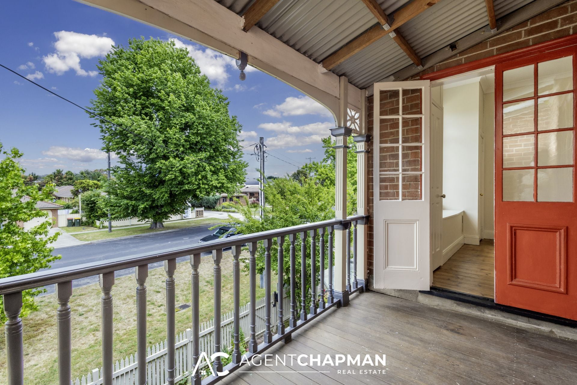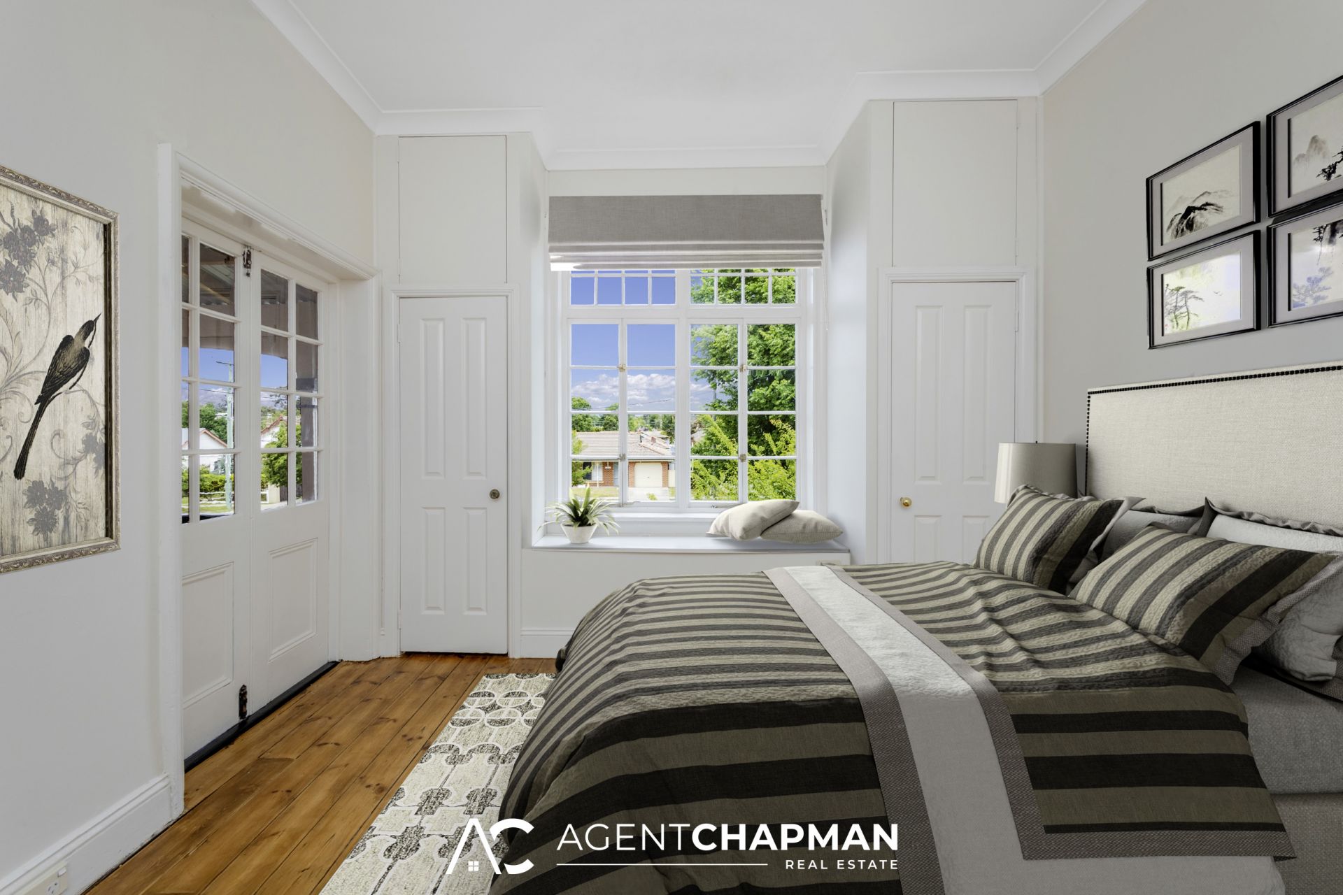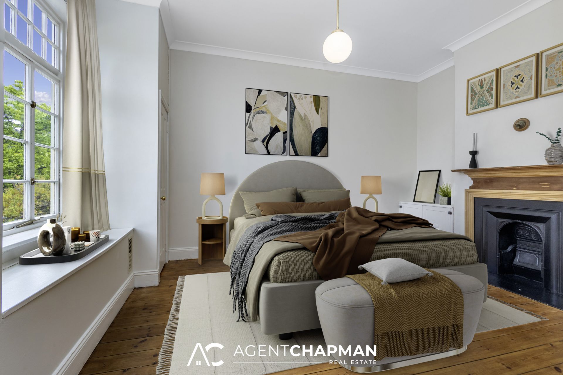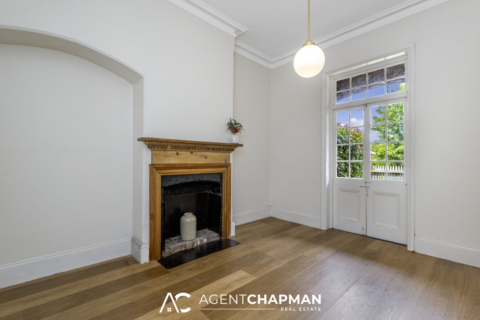 – Bed 2 with built-in robe, timber floorboards, ornate fireplace and French door access to front balcony.