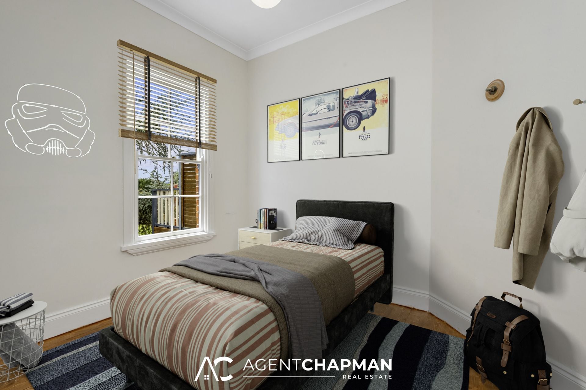 – Bed 3 with built-in robe and timber floorboards.