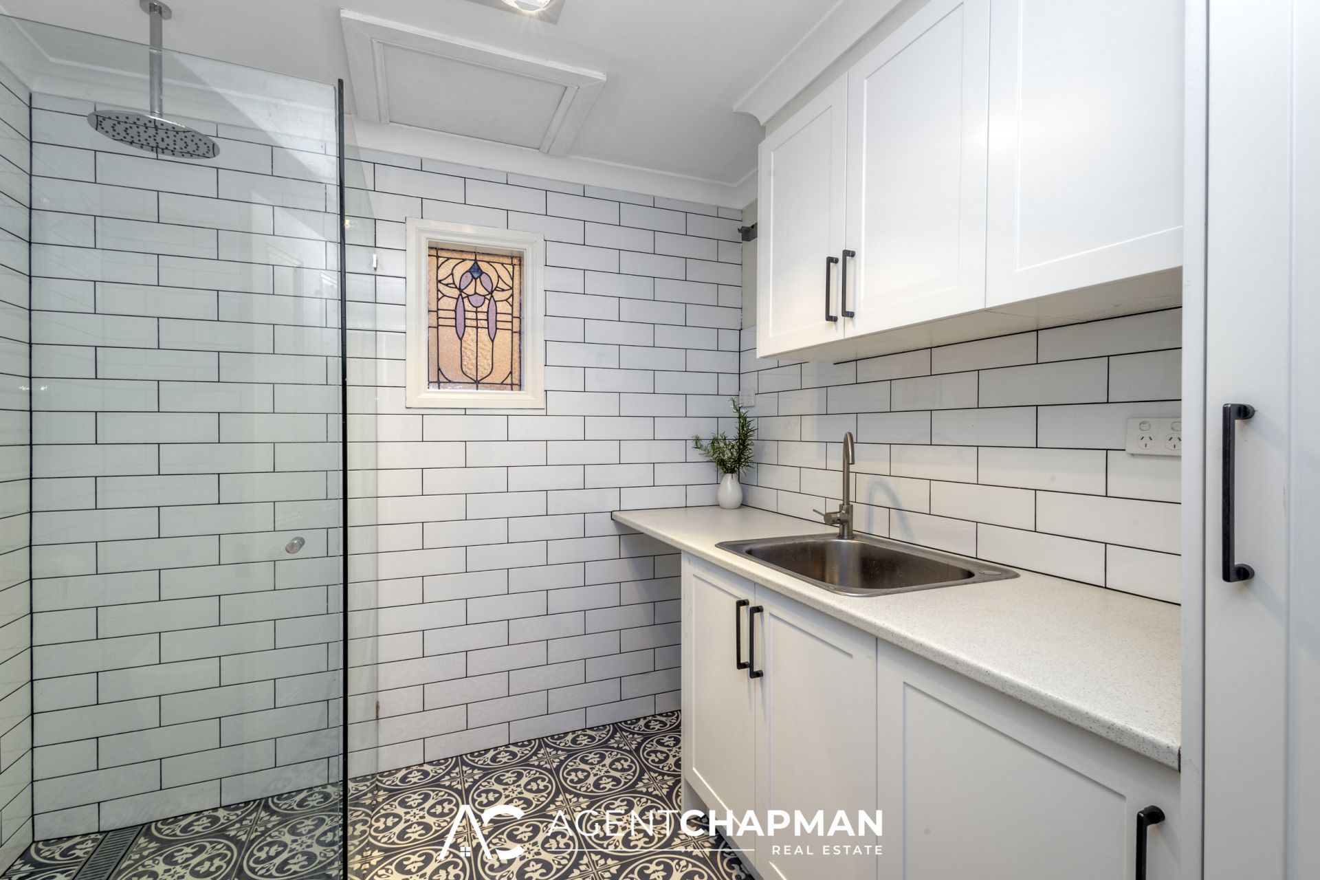 – Renovated bathroom/laundry with shower, vanity, toilet and built-in cabinetry.