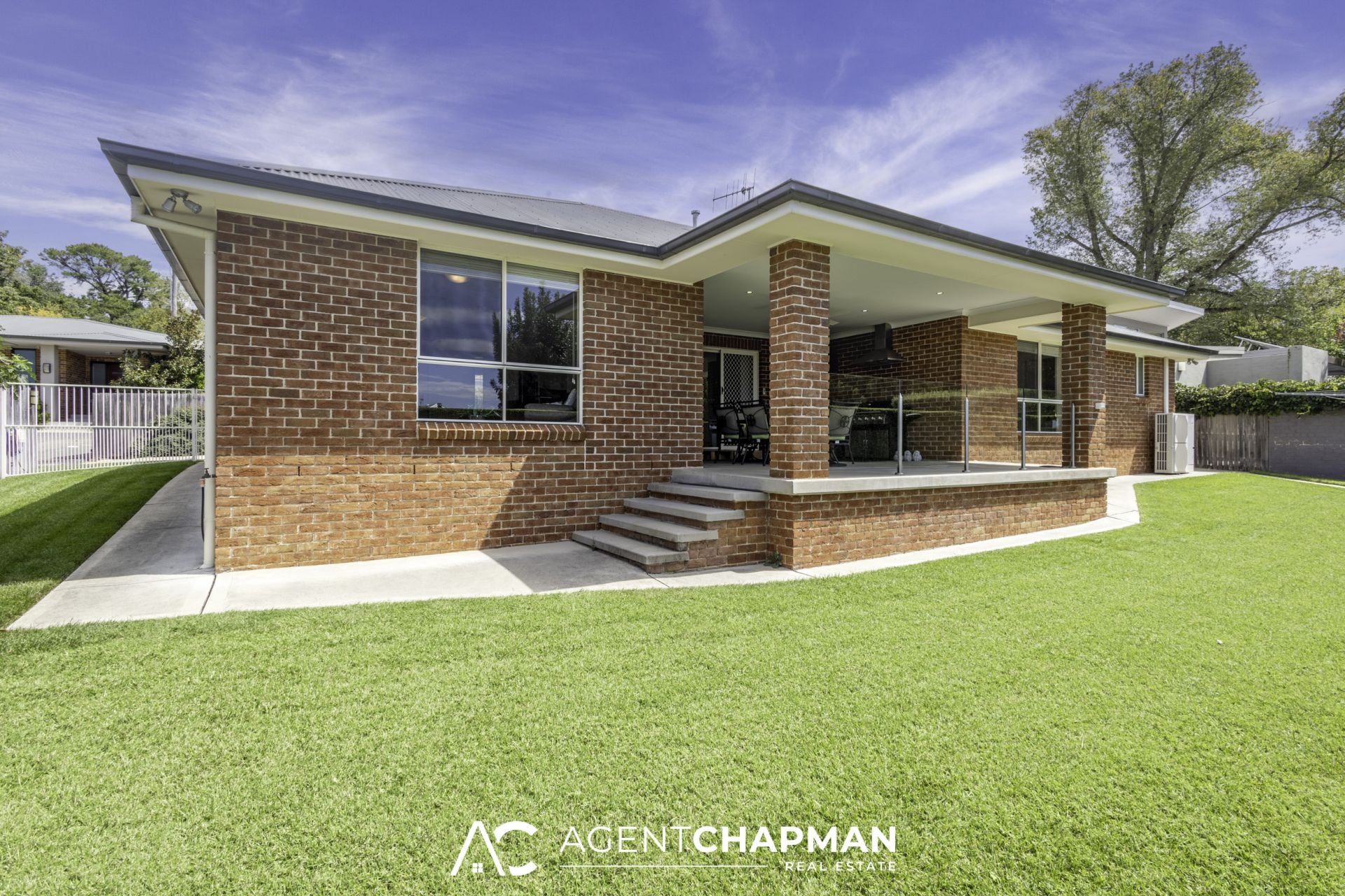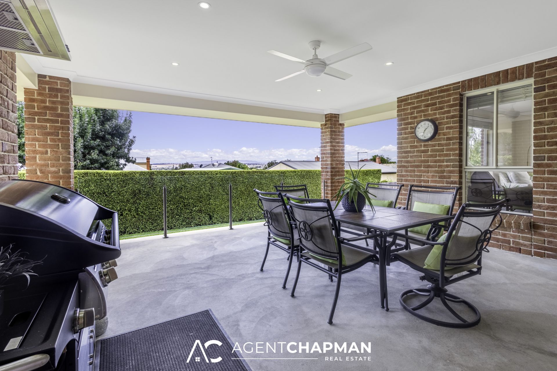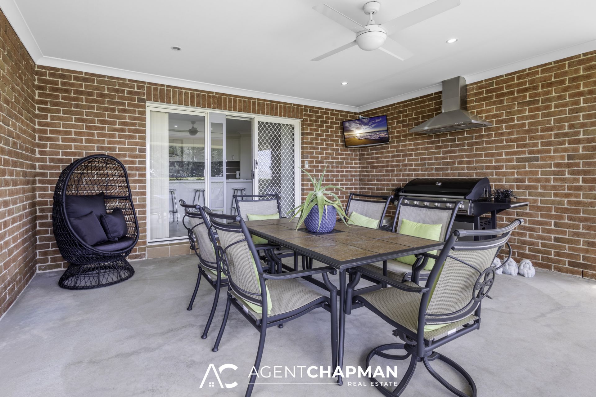 – Sliding glass door leads to undercover entertaining area complete with stainless-steel canopy rangehood for the BBQ, TV point and ceiling fan.