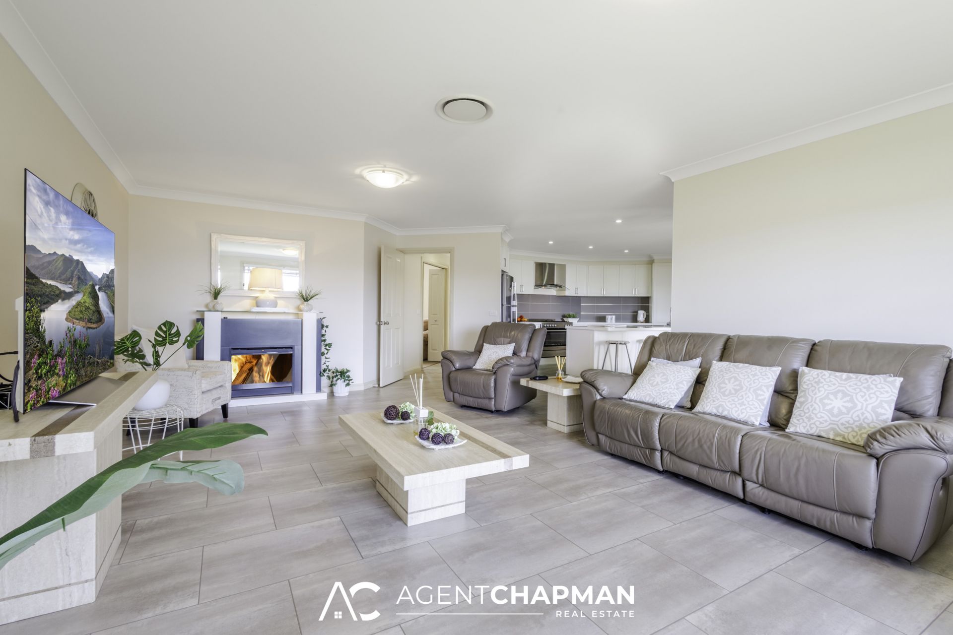– Generous open-plan living area with electric fireplace enjoys a north-easterly aspect.