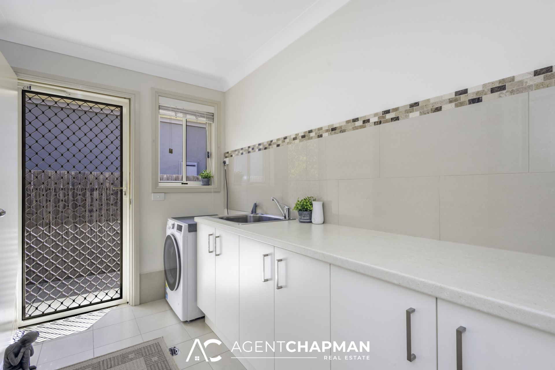 – Spacious laundry with generous bench space, cupboards, wall to wall built-in storage and external access.