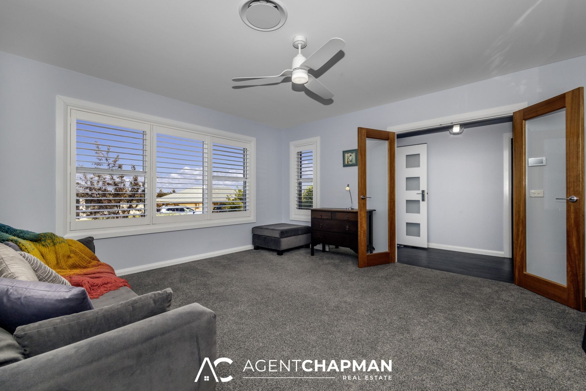 – Formal lounge room upon entry features plantation shutters and ceiling fan and can be closed off from the hallway.