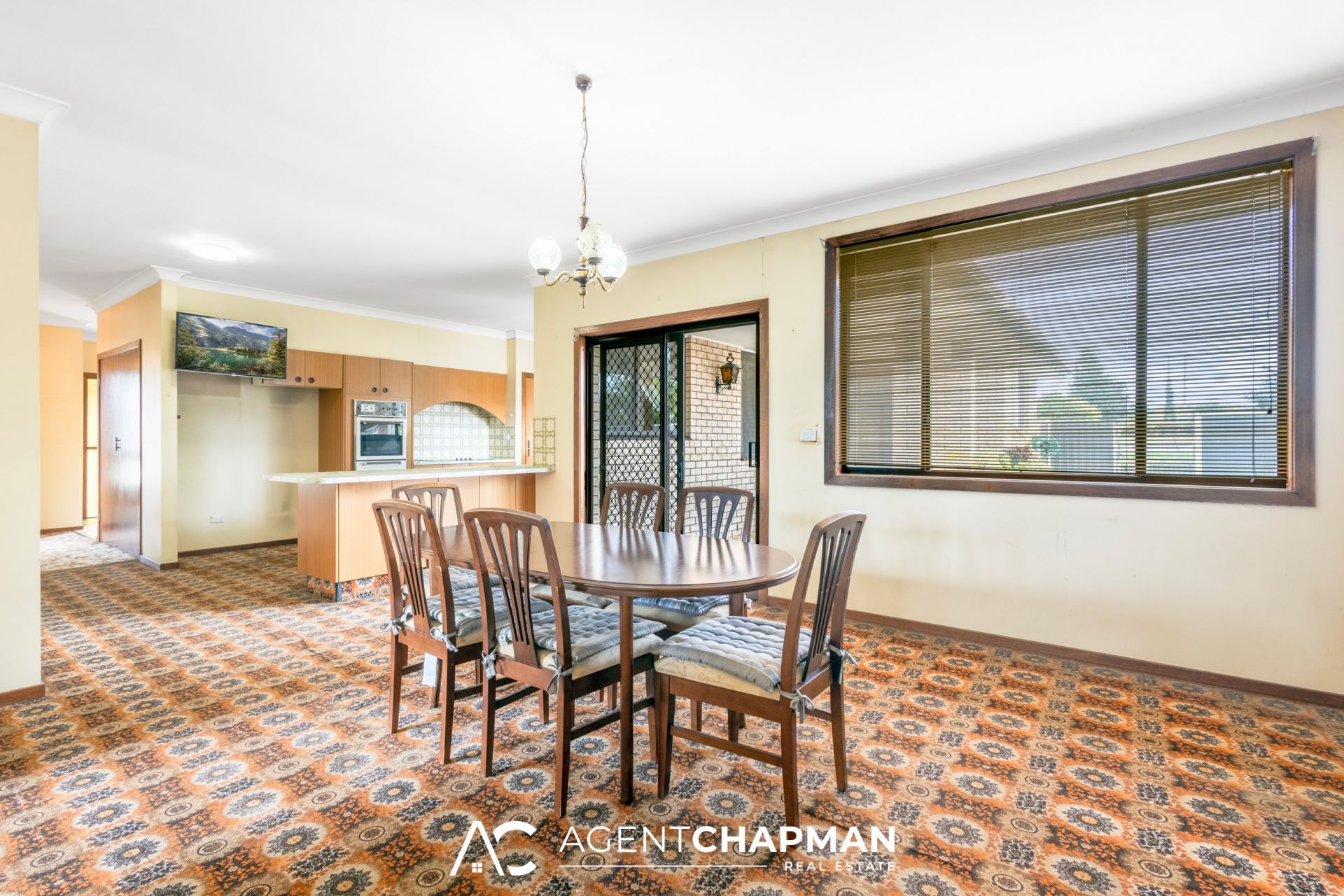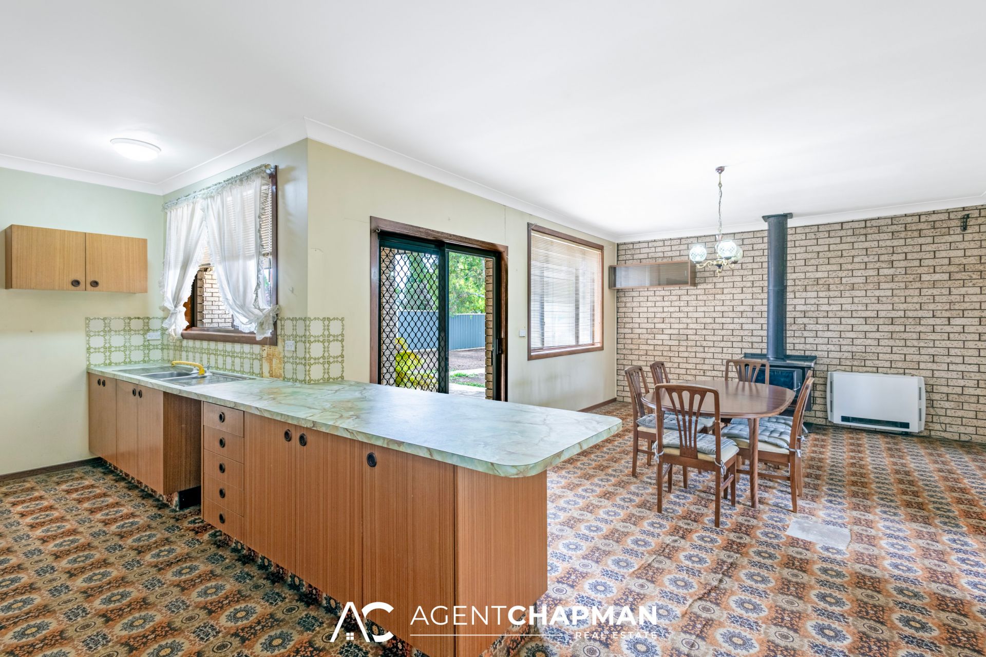 * Family room off the kitchen with slow combustion wood fireplace opens out to the back undercover patio.